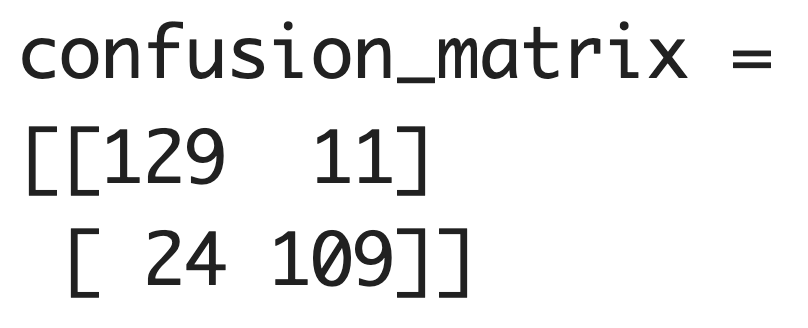 | (1)混同行列(confusion matrix) | 予測の正誤を表す表。 | [[129, 11], [24, 109]] |