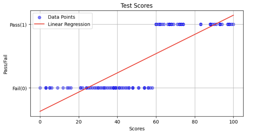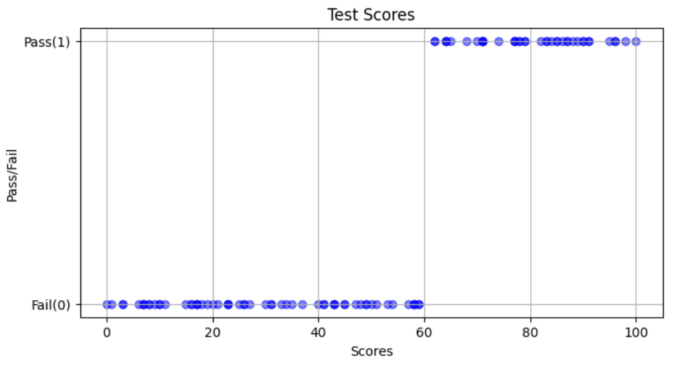 以下、テストの点数(横軸)に応じて、合否(縦軸)を算出するようなものを出している。合格は1、不合格は0として表示。
