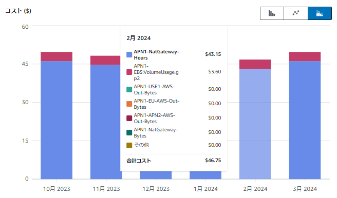 正直、認識している人は常識かとは思いますが、会社は企業でAWSを使っている場合は、NATゲートウェイの値段なんか気にならない額(EC2などほうがもっと高い)かと思って見過ごしてしまいがちですが、個人(自腹)でやっていると正直この金額は高いので使ってない人は削除しましょー。