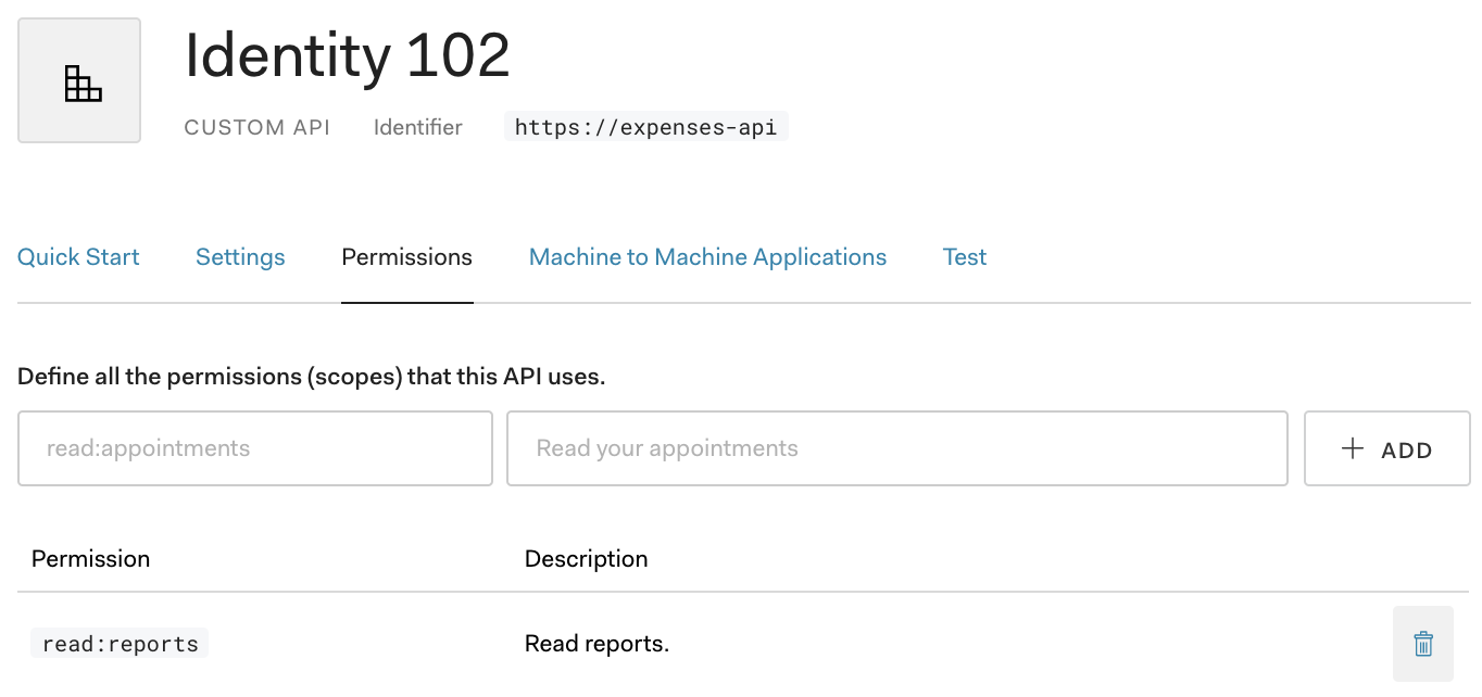 "Permissions"タブをクリック、"Define all the permissionsxxx"に"read:reports"を、"Description"に任意の説明文を入力して"ADD"を押します。