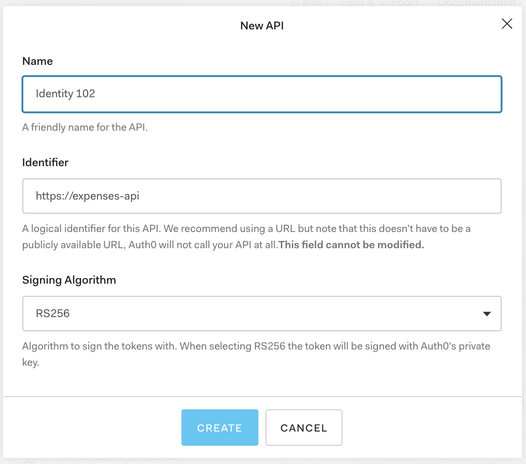 "Name"に任意の名前を入力し、"Identifier"に"https://expenses-api"を入力して"CREATE"を押します。