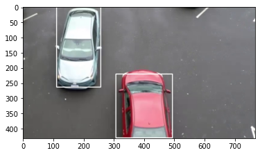 forにより推論結果から、1件ずつ自動車のある位置を取り出し、OpenCVのrectangle関数で、その座標に白い枠を描画しています2。