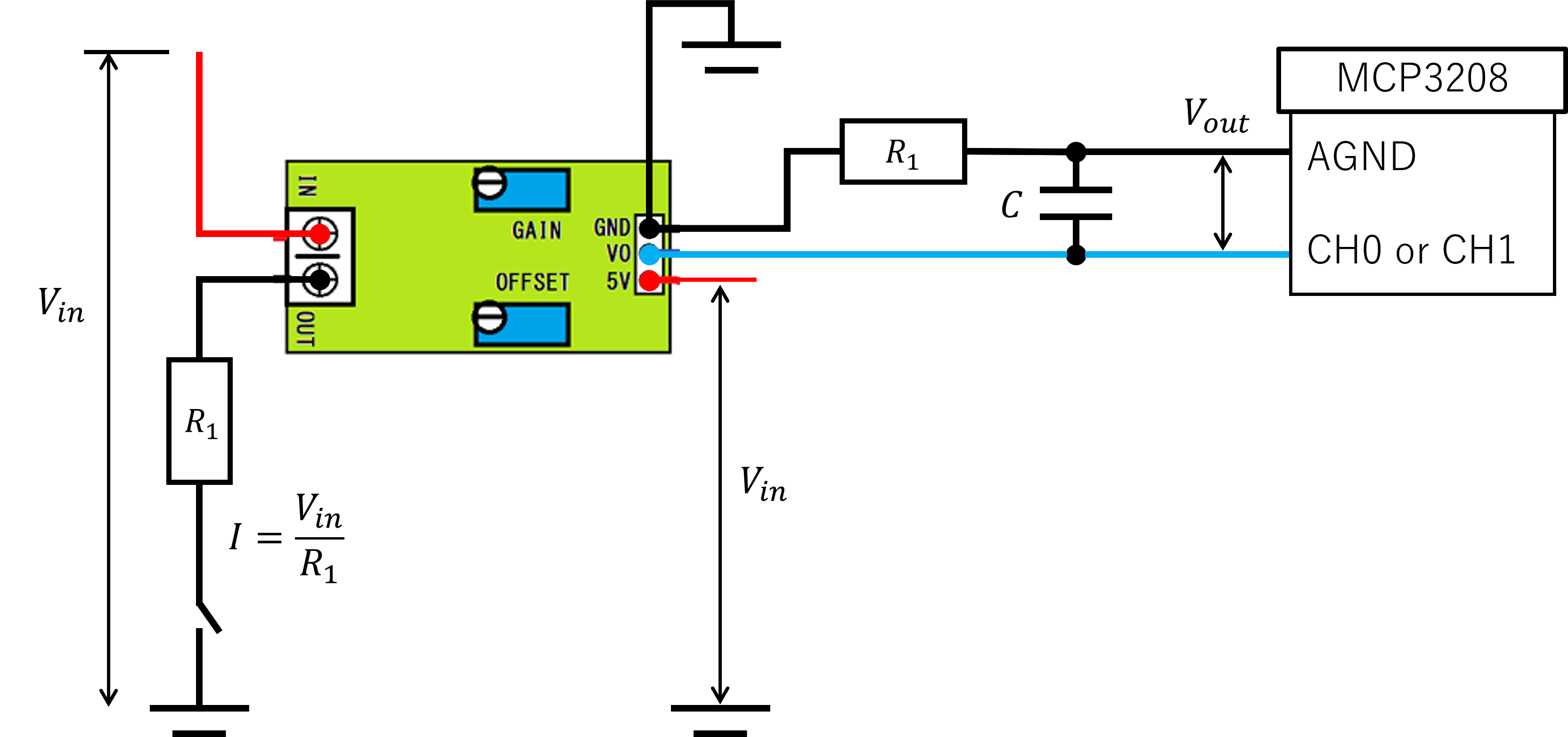 上表で示した機器を下図のように接続します。ASC712の出力電圧にはノイズが乗っているので、LPF(RC回路)を使って除去します。