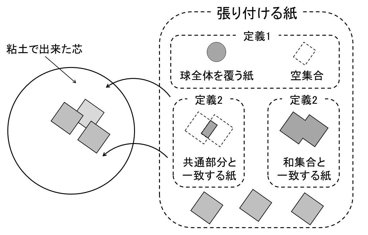 以上をまとめると,張り子の球を位相空間と呼ぶには,次のように紙を貼り付けなければならないことがわかります.