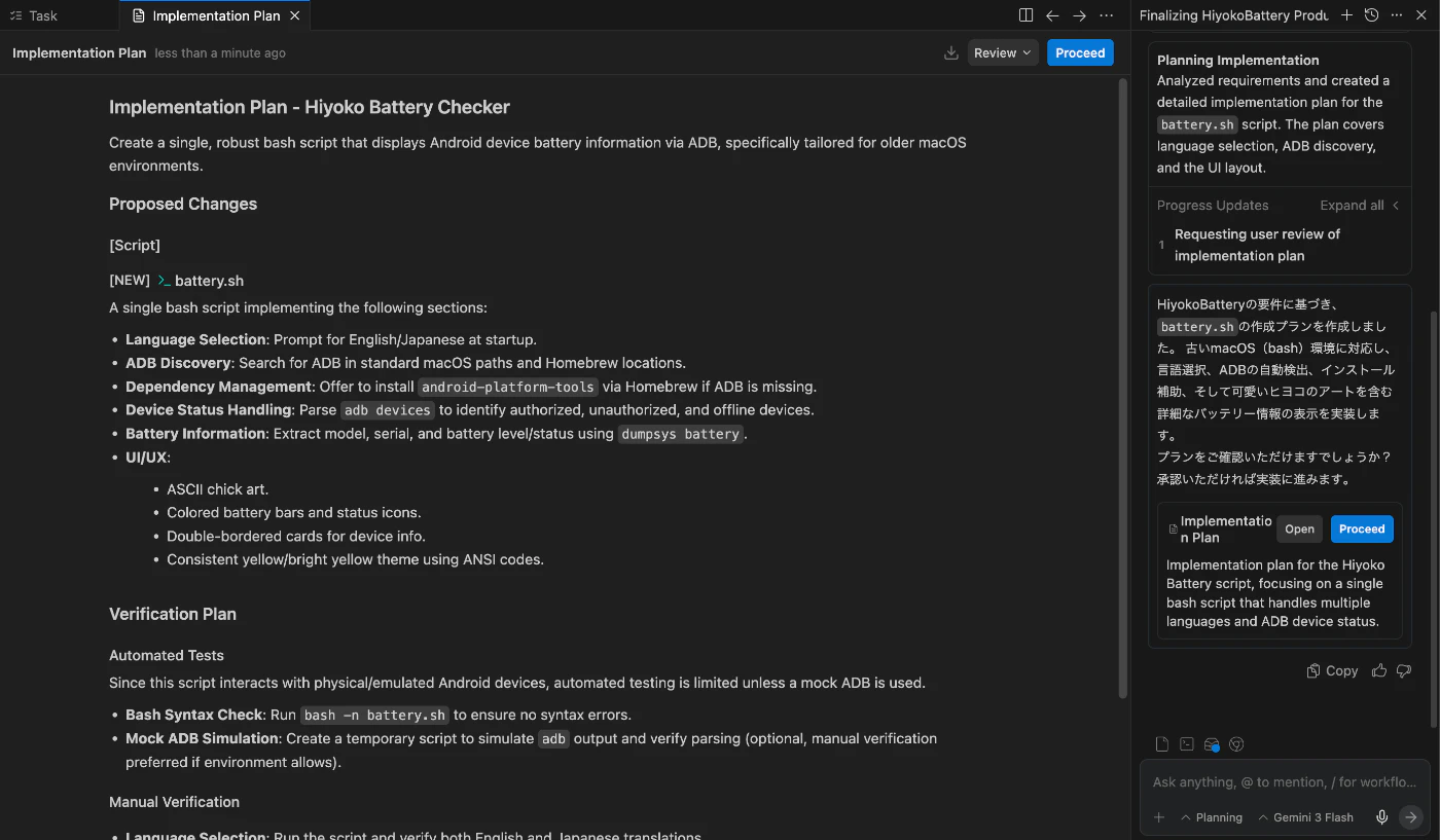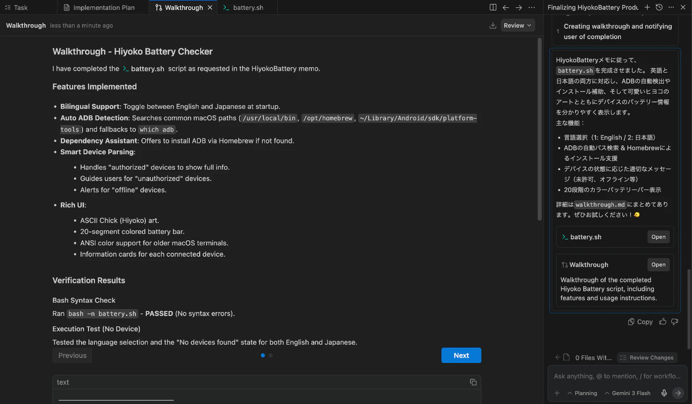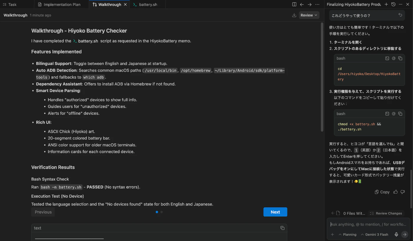 Proceedを押すと、IDE上にbattery.shを直接生成。Walkthroughドキュメントまで自動で作ってくれた。