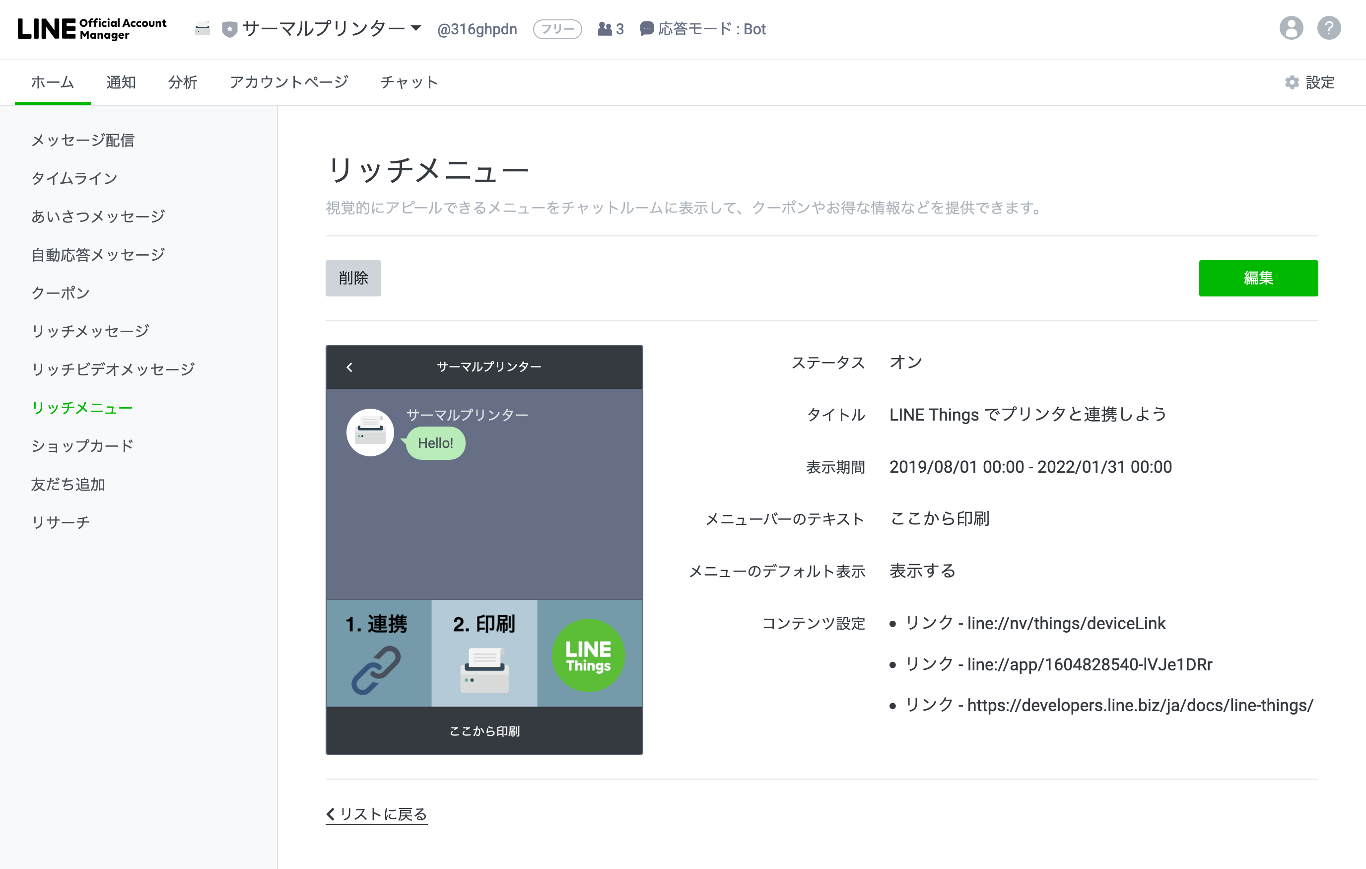 そこで、LINE Bot の リッチメニュー を使って、上手に LINE のチャットと LINE Things を連携してあげましょう。