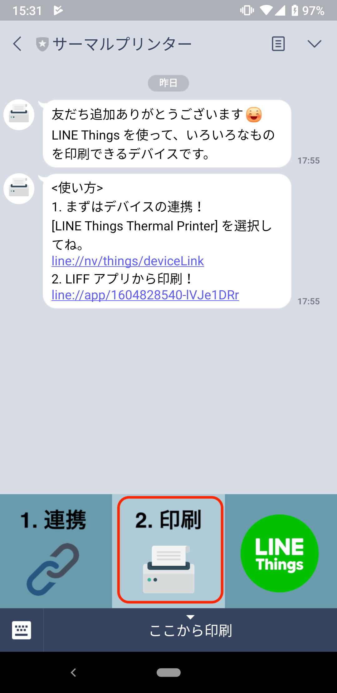 上記の例では、"2. 印刷" というリッチメニューの画像を押すと、LIFF が開くようになっています。