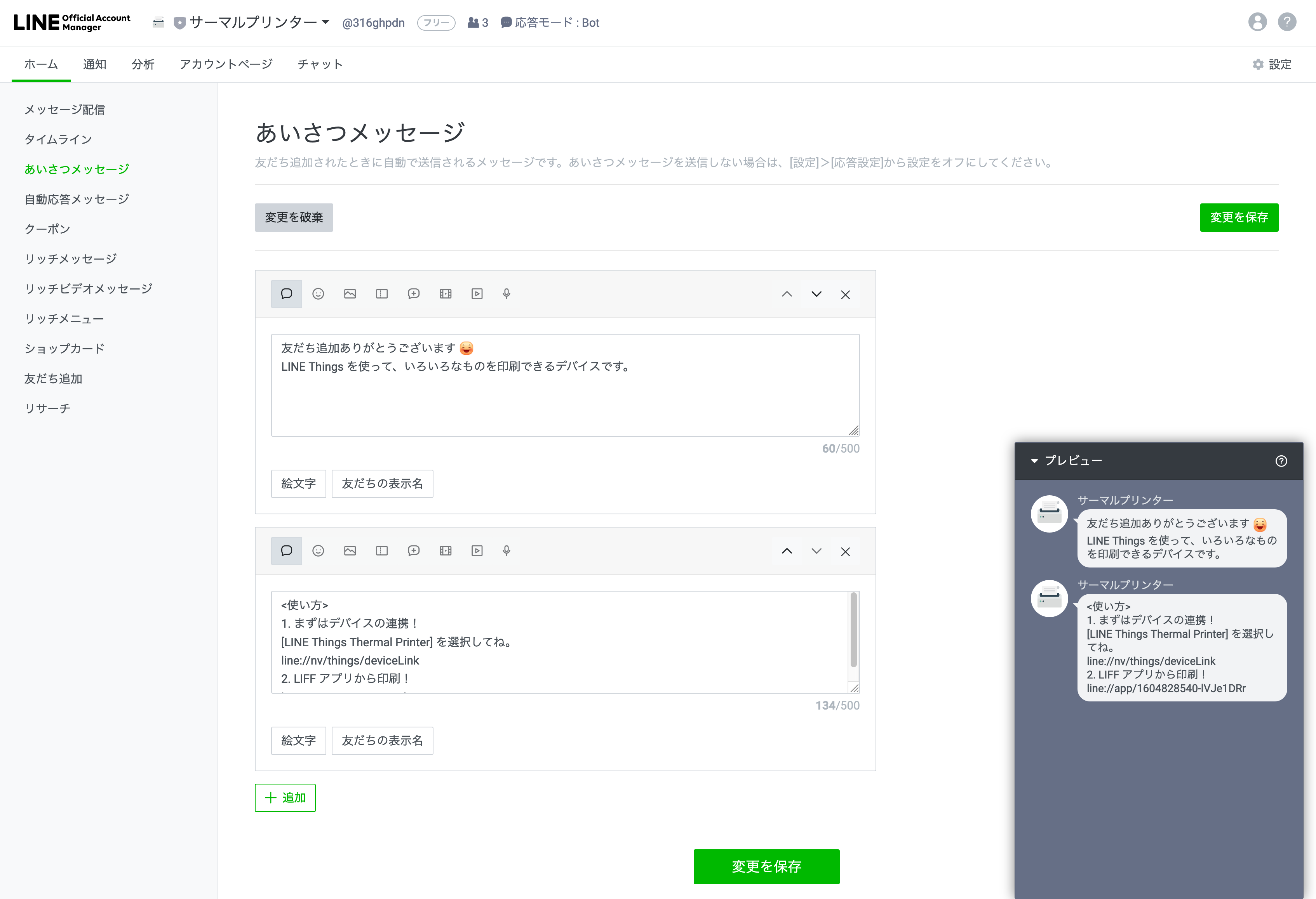 あいさつメッセージの設定は、LINE Official Account Manager の "あいさつメッセージ" から行うことができます。
