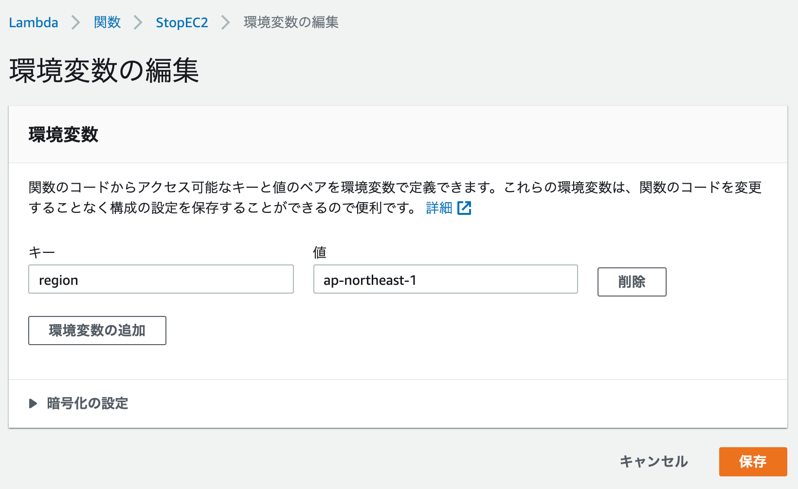 環境変数は、対象のインスタンスのリージョンを設定する。今回は、東京リージョンを設定します。