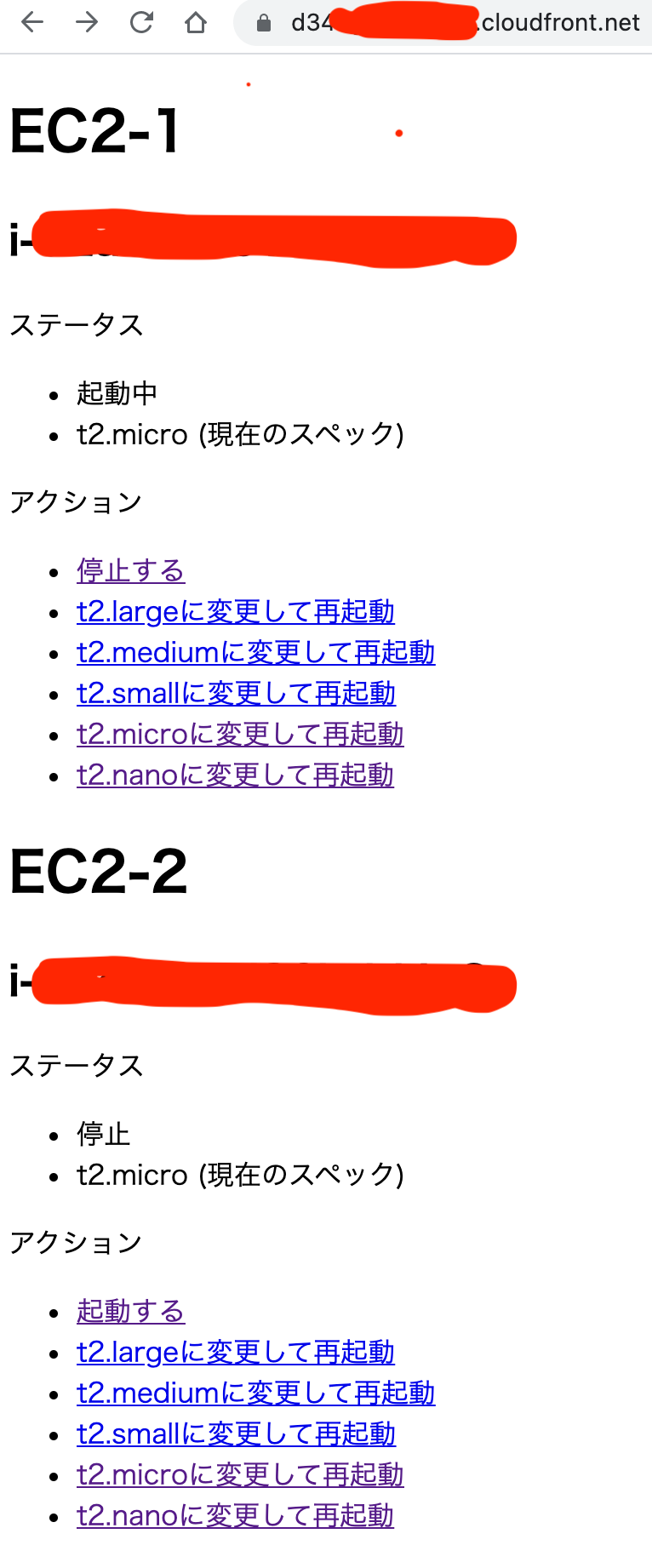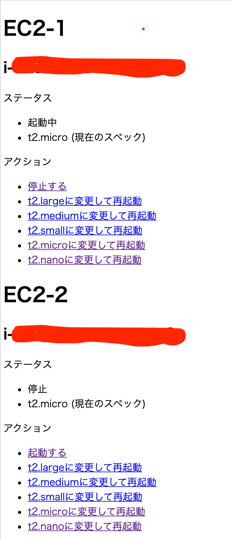 EC2の現在のスペックと起動有無が非同期で表示され、ワンクリックでEC2を起動・停止・スペック変更できます。