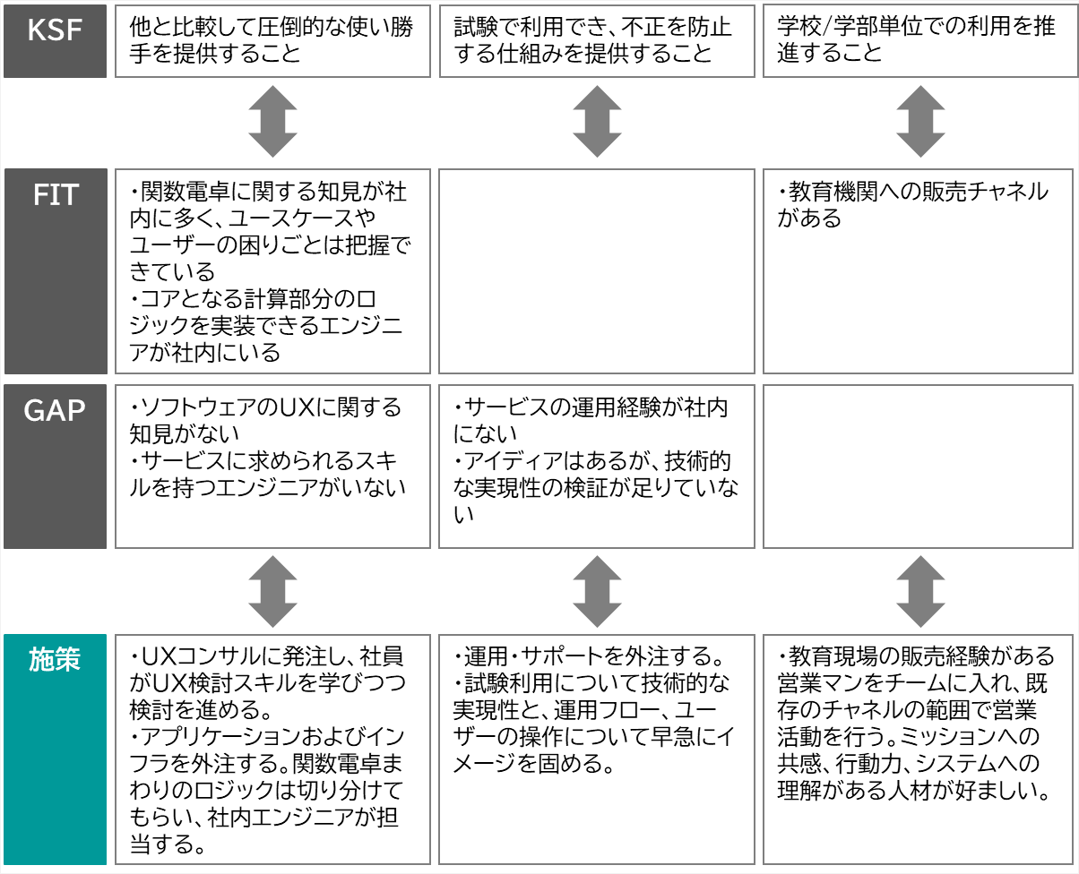 施策については「まず最低限のアプリを提供してみて、顧客(教育現場)の反応を確認する」というレベルで記載しています。ビジネスの拡大とともに要求および施策の変化があると思いますので、常に見直す必要があります。