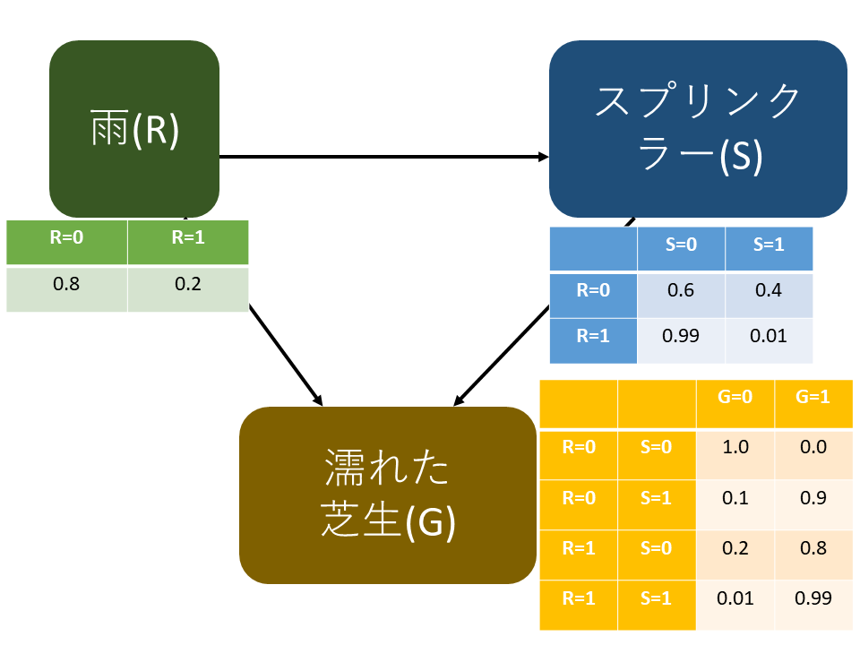 青の表ではスプリンクラーが作動しない確率$S=0$と作動する確率$S=1$を$R=0$の時,$R=1$の時で別々で与えたいます.黄色の表に関しても同様です.