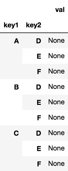 df = pd.DataFrame(list(product(list('ABC'), list('DEF'))), columns=keys).set_index(keys)