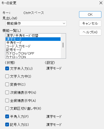 状態 「文字未入力」 「半角入力」「記号入力」にチェックを付けて「機能一覧」から「漢字モード」を選択