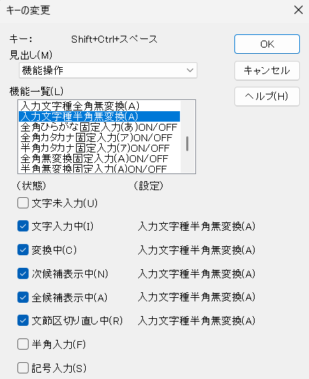 残りの状態にチェックを付けて「機能一覧」から「入力文字種半角無変換(A)」を選択.