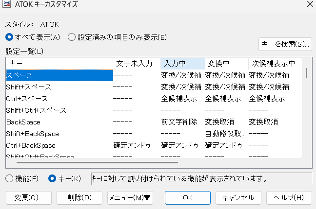 キー入力に割り当てられた操作が一覧表示されている.同じキーでも「文字未入力」「文字入力中」など状態に応じて異なる操作を割り当てることができる.