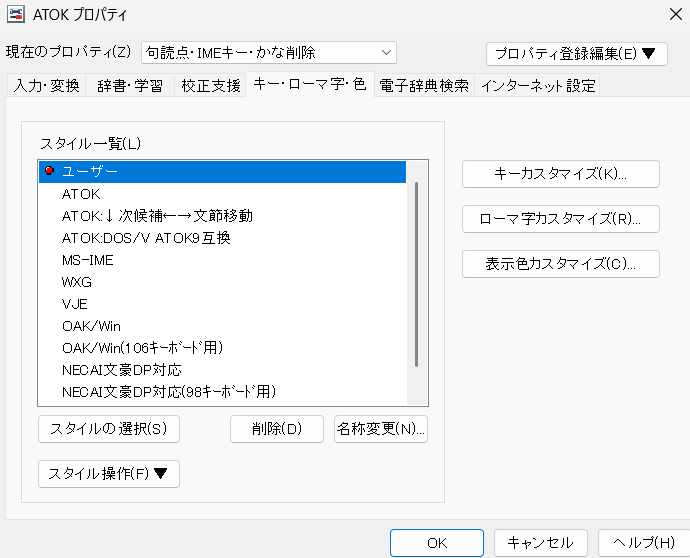ATOKツールでは入力モード変更などの操作のキー割り当てを変更してプロパティとして保存できる.