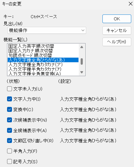 残りの状態にチェックを付けて「機能一覧」から「入力文字種全角ひらがな(あ)」を選択.