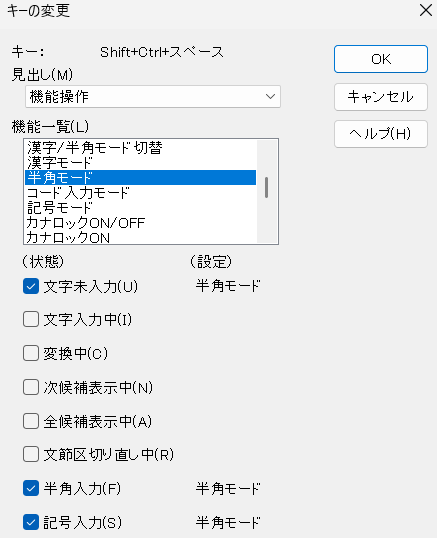 状態「文字未入力」「半角入力」「記号入力」にチェックを付けて「機能一覧」から「半角モード」を選択
