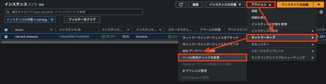 1.4.2. 『作成されたEC2をチェック』 → 『アクション』 → 『ネットワーキング』 → 『ソース/宛先チェック変更』