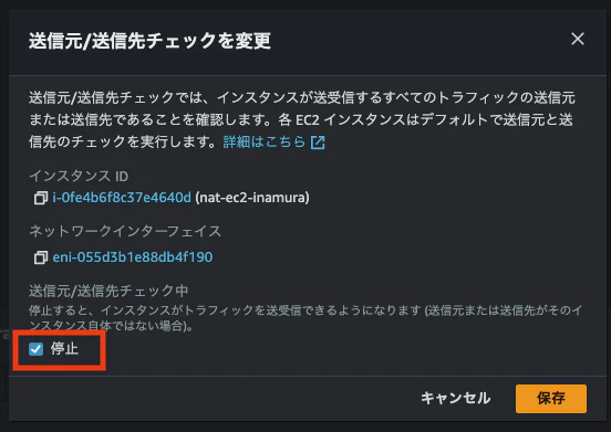 NATインスタンスは、プライベートサブネットのインスタンスからのトラフィックを転送する機能のため、チェックを無効にして正しく機能するようにするための設定。