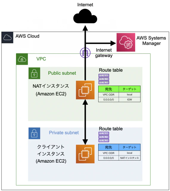 `POSTROUTING` チェーン(Iptablesの適用ルールの1つ)に `MASQUERADE` ターゲット(送信元IPをNATインスタンスのパブリックIPに変更するという意味)が設定されていることで、NAT機能が実現されている。