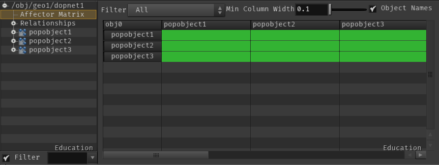 ジオメトリスプレッドシートのAffector Matrixを見てみると、すべてのPOPオブジェクトが互いに影響を与えていることがわかると思います.