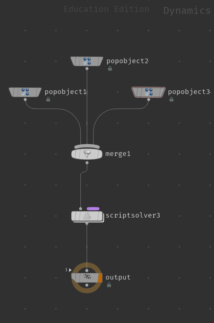 気分を変えてpop object3つをmergeにつないだ後script solverにつなぎます.