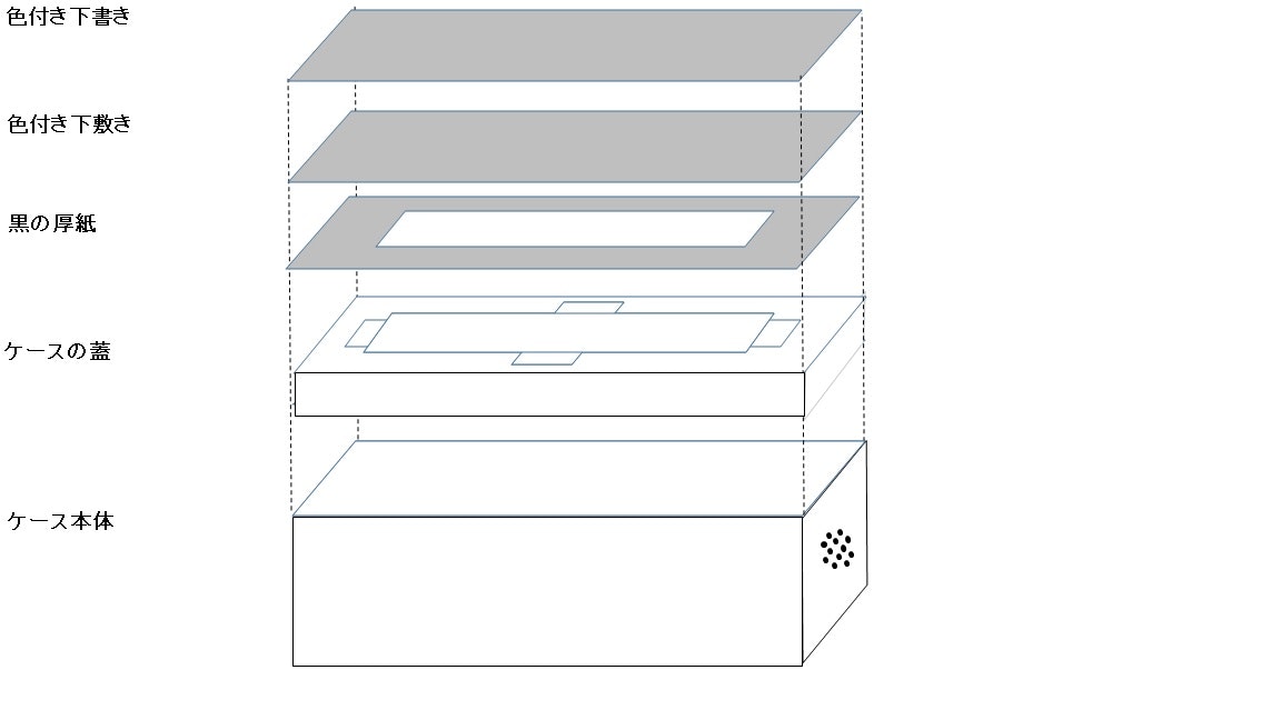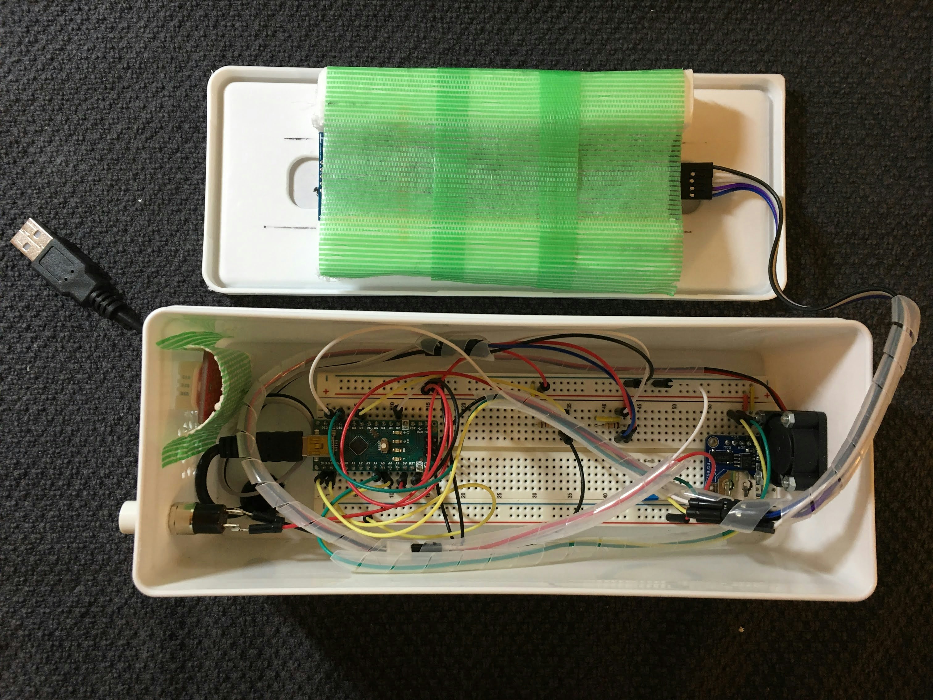 DHT-22をブレッドボードに差してみたのですが、LED自身が発熱するため温度が上がってしまいました。ケースを密閉していたのが良くなかったようです。そこで両端をドリルで穴をいくつか開け、ファンと温度センサーをケースの両端に取り付けました。温湿度センサーは、緩衝材を軽くかぶせて、テープで固定しています。