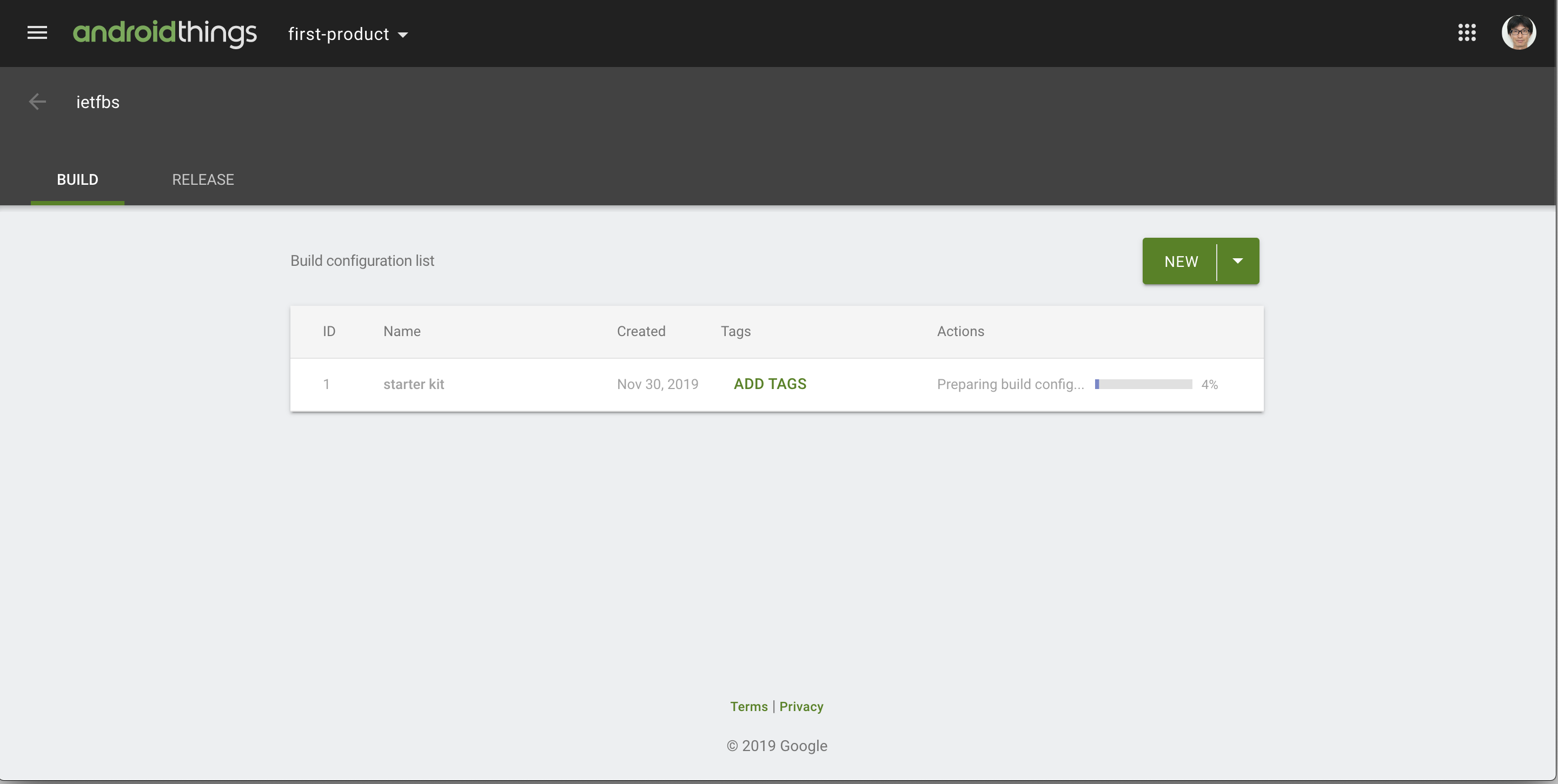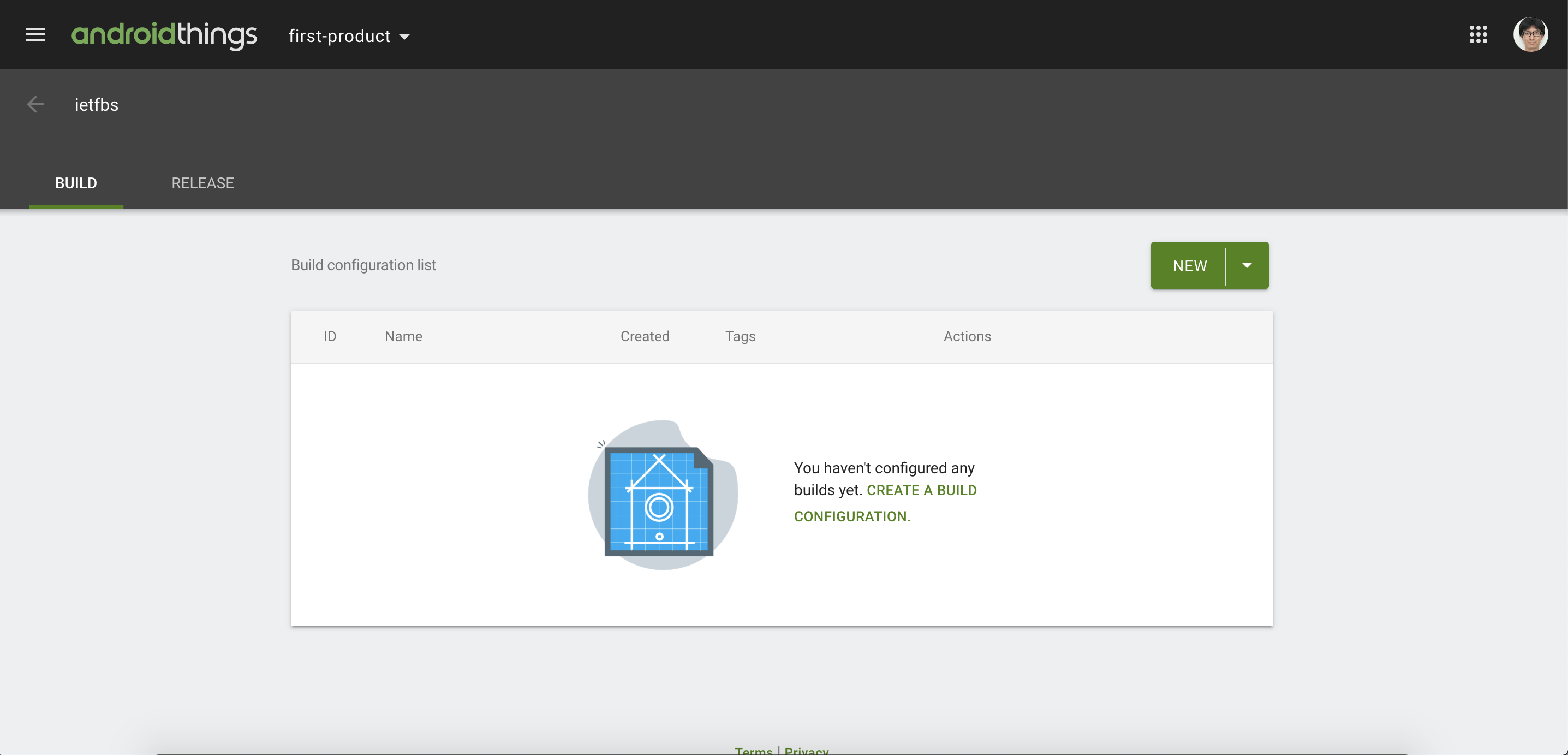 BUILD CONFIGURATIONを作ろう と表示されているので NEW ボタンをクリックする。