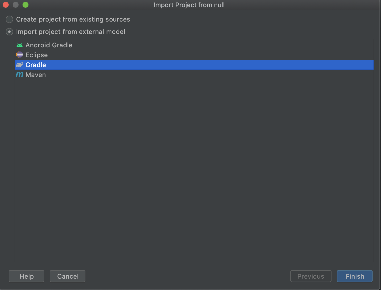 Import project from external modelをチェック → Gradleを選択 → Finish