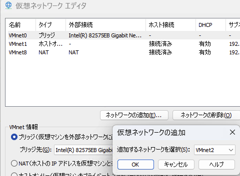 次に、仮想ネットワークVMnet2を追加。