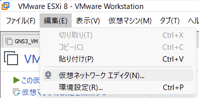 よくある新規インストールから、ESXiのISOファイル、適当なディスクサイズおよびメモリサイズを指定する。次に、仮想ネットワークエディタをクリックし、ネットワークI/Fの設定を行う。