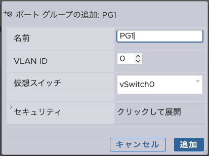 次にポートグループを追加。名称はPG1とPC2とする。