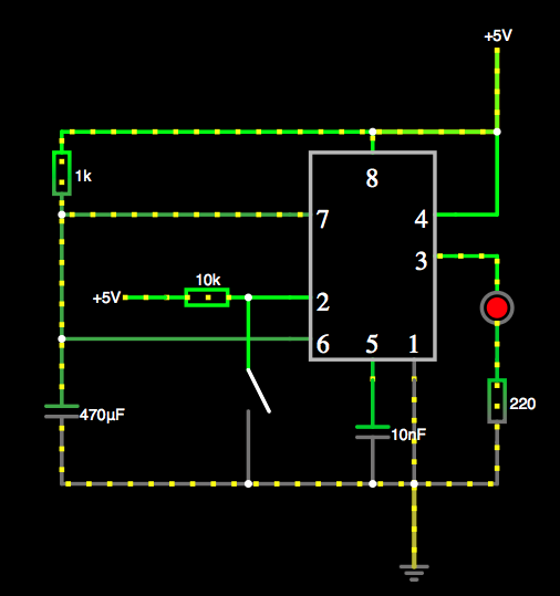 下記は、タクトスイッチ押下後、しばらくの間、LEDが点灯し、その後消灯する回路。
