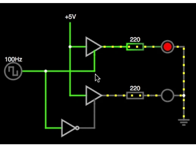 中央2つがトライステートバッファ、片方に"1"を、もう片方には"0"を入力し、片方は導通がある状態を、もう片方にはそれがない状態を作り出す。LEDの点灯により、その状態を視覚化する。回路シミュレーターでは、矩形波及びNOT回路により、"1"および"0"を交互に作り出している(後述する実回路では、矩形波の代わりにPCからの入力を用いた)。