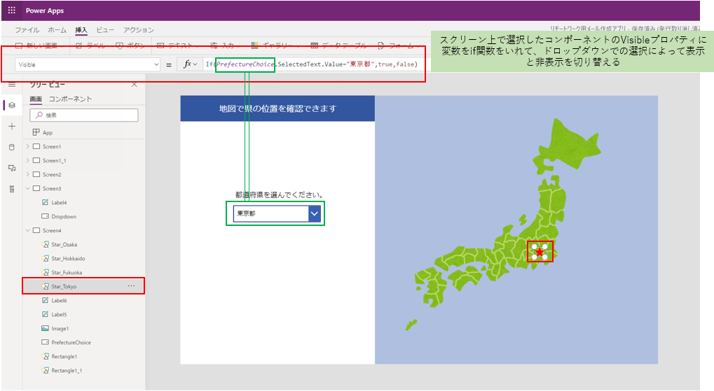 図形や画像の挿入を行いつつ、同じ要領でスクリーンをデザインしていきます。コンポーネントが持つプロパティに変数や関数を入力することで動的な処理を実装することができます。
