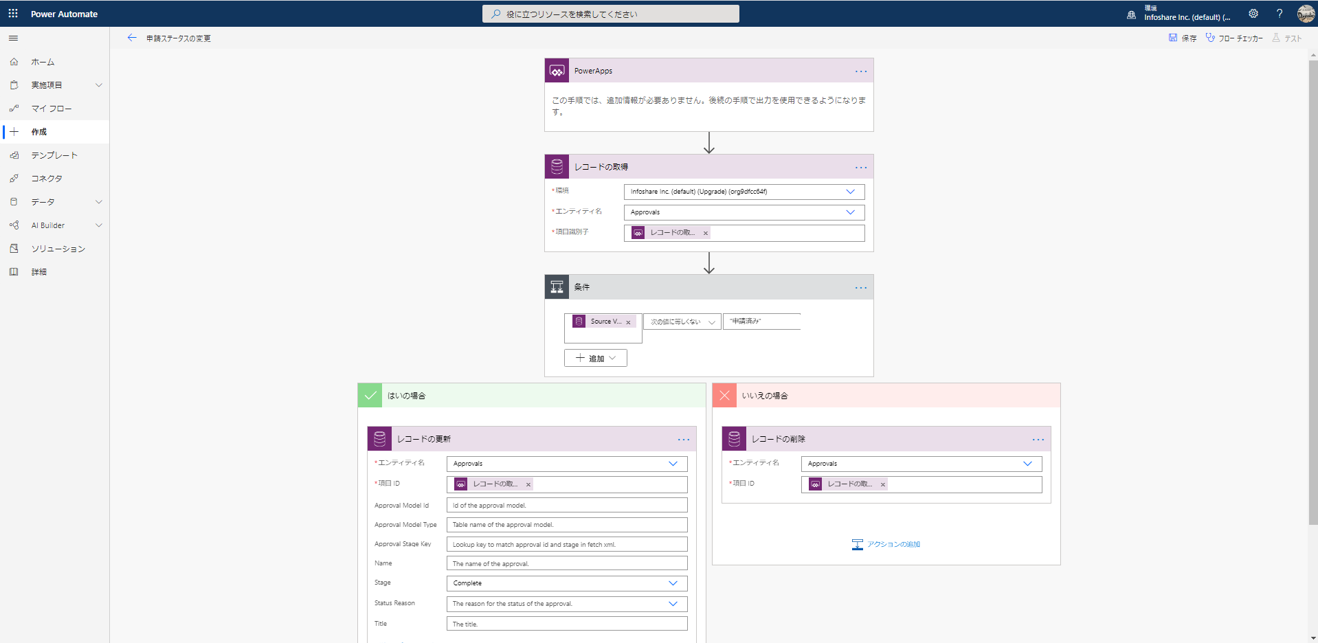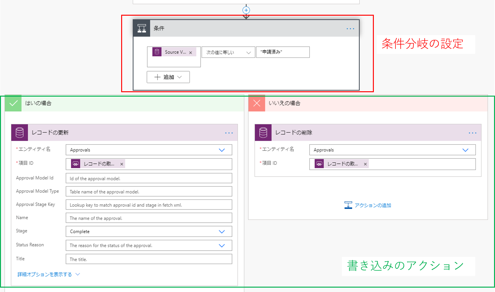 上記では例として「はい」でレコードのステータス枠を「申請済み」に更新するアクションを、「いいえ」にレコードを削除するアクションを置いています。どちらも操作するレコードのデータ元はCommon Data Service。