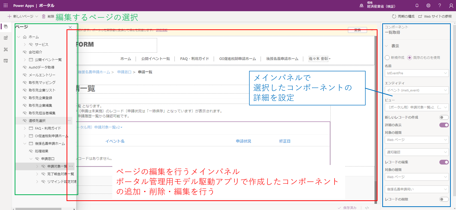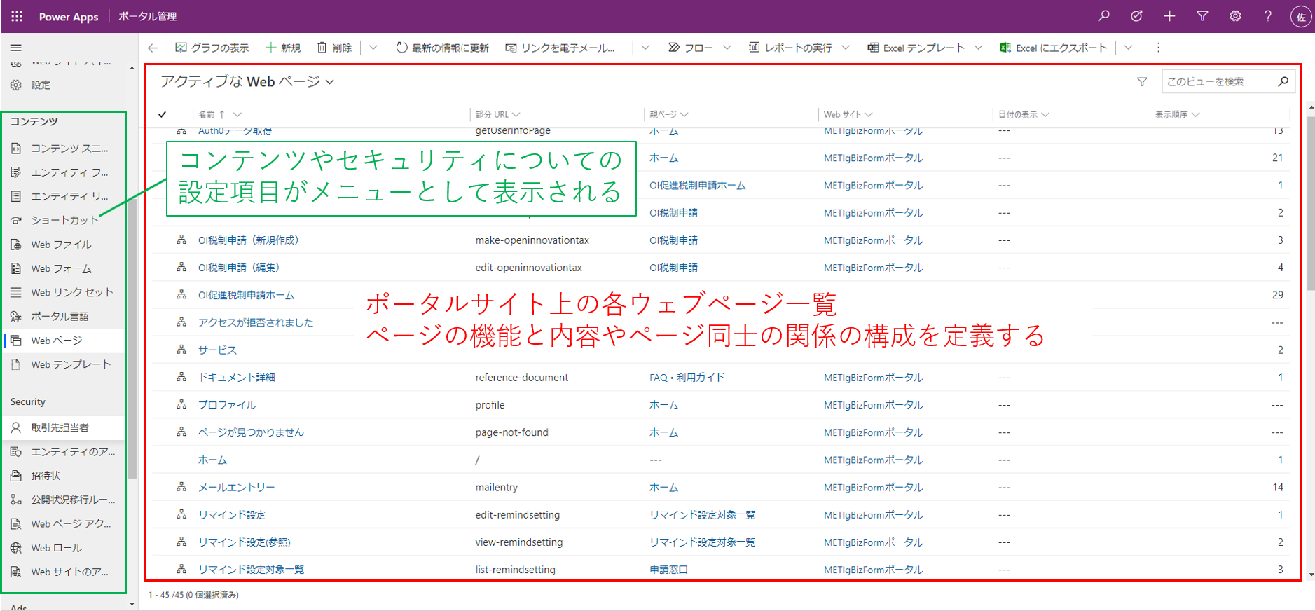 ポータル管理用モデル駆動アプリで、リストビューやウェブページ、ページの階層構造、入力フォーム、表示するコンテンツリソース、アクセス制御のルール、ユーザー、ユーザーに与えるwebロールなど、ポータル上で表示したり運用に必要となったりするコンポーネントを作成します。