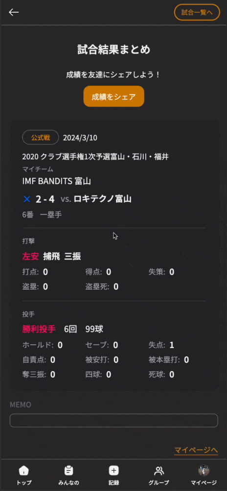 「個人成績記録機能」 を使用して、試合のスコアや対戦相手などの試合結果・打席や打点数などの打撃結果・投球数や失点数などの投手結果を1試合ごとに記録することができ、 打率や防御率などの成績を自動で計算して管理することができます。
