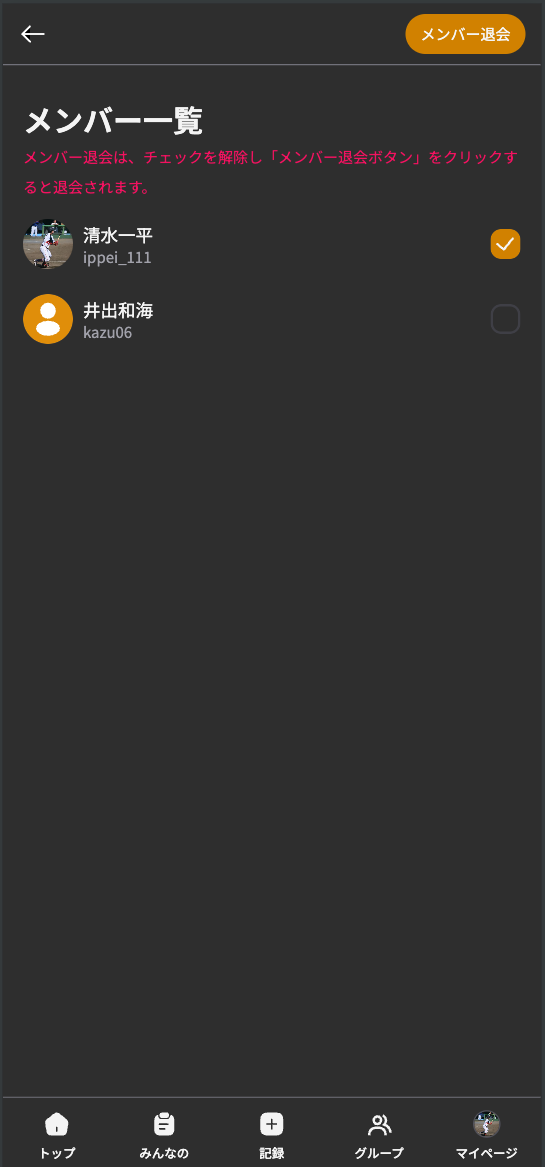 | メンバー一覧画面で、退会させたいユーザーのチェックを解除することで、特定のユーザーまたは自分自身を退会させることができます。 | グループ編集画面では、「アイコン画像」「グループ名」を変更することができます。また、グループ作成者のみ「グループを削除」することができます。 |