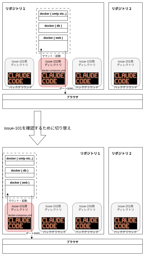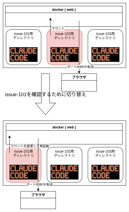 最初の図ではいちいち自分で docker のマウントディレクトリを切り替えるイメージでしたが、この案では