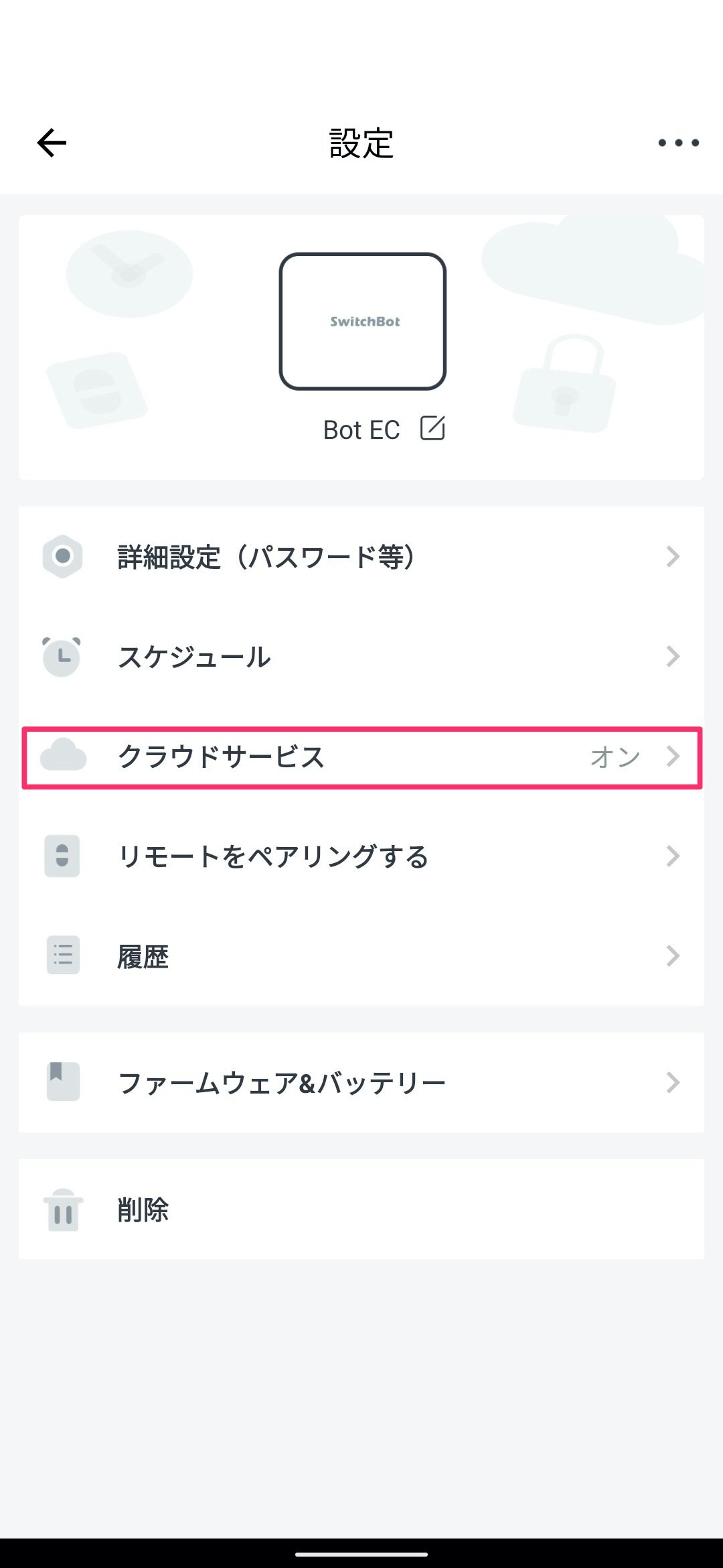 APIから操作するために、SwitchBotの「クラウドサービス」をオンにしてください。