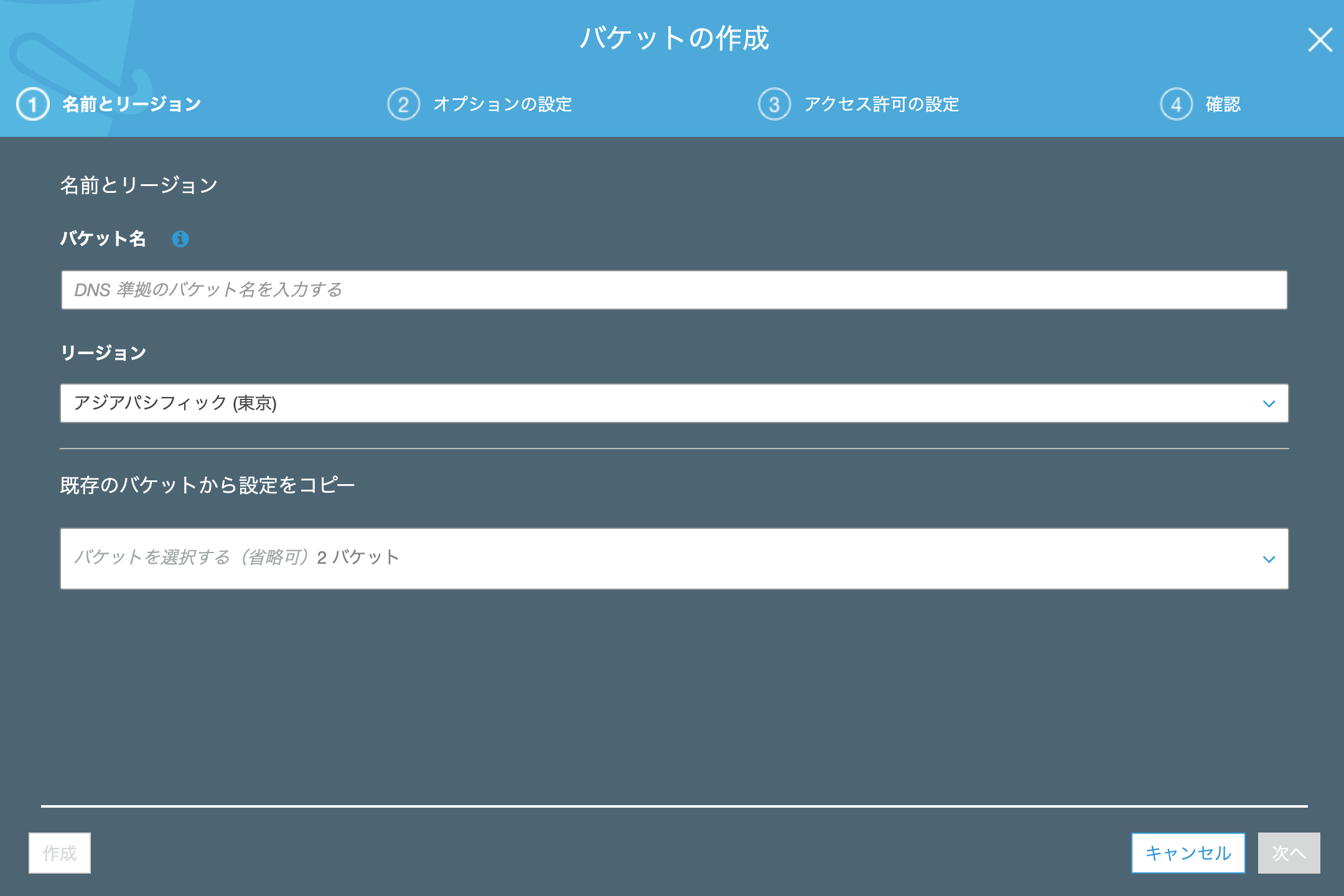 「バケット名」は他のユーザーが作ったバケットと重複した名称は使うことができません。