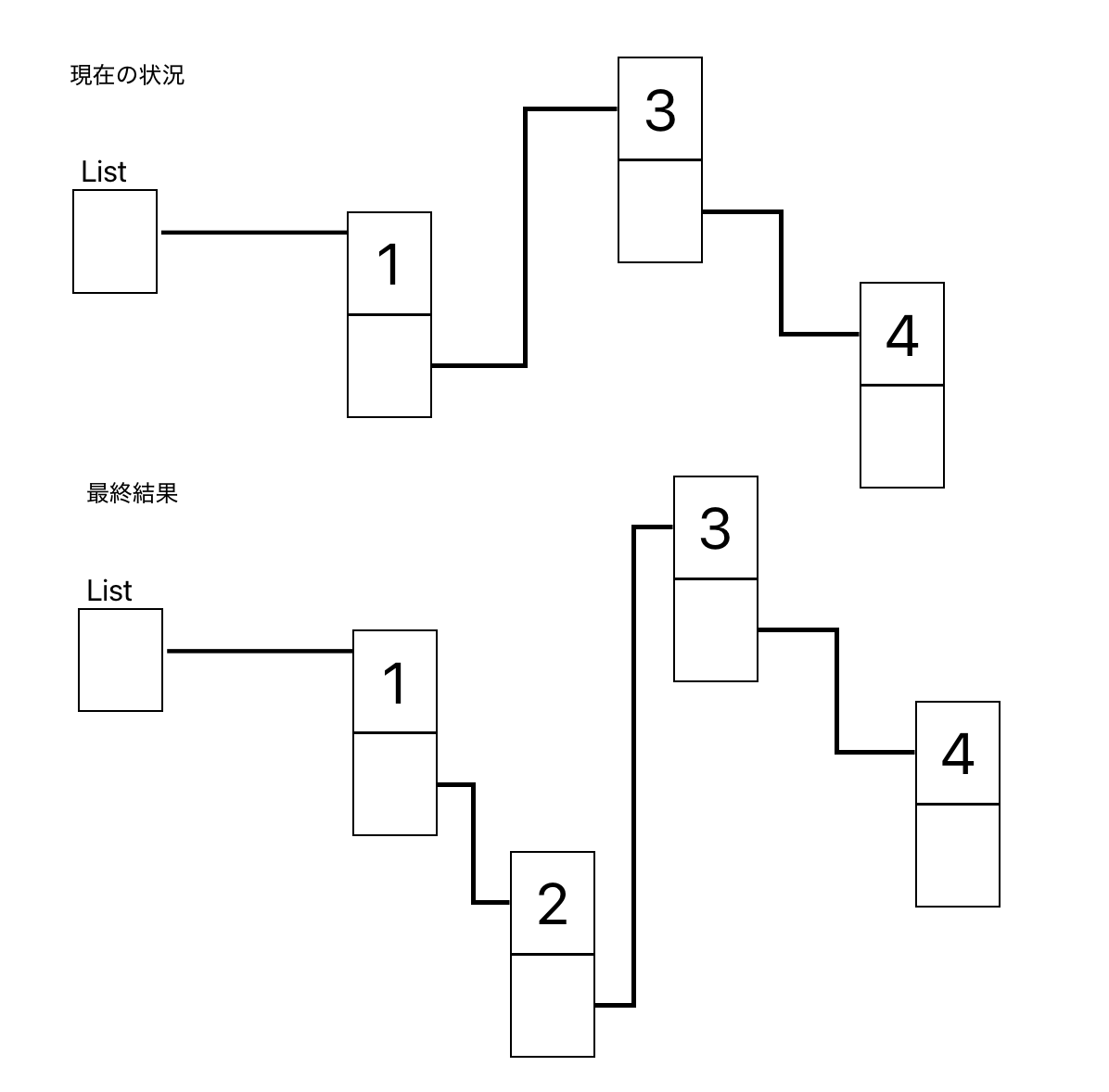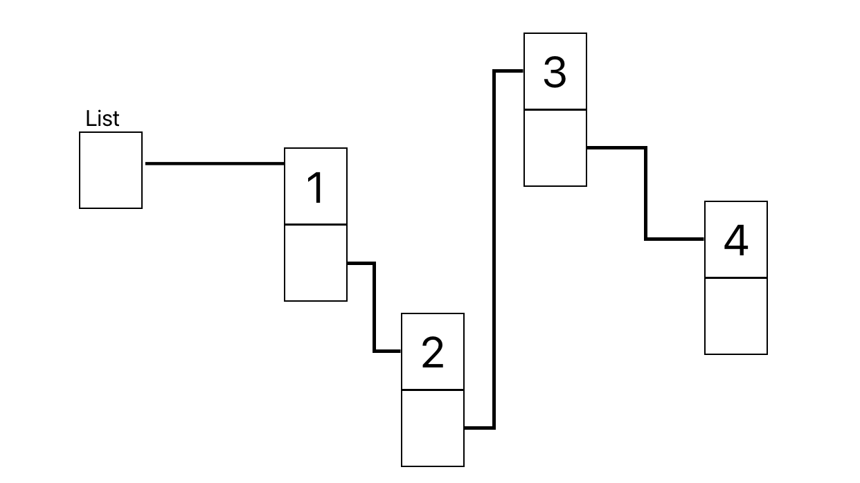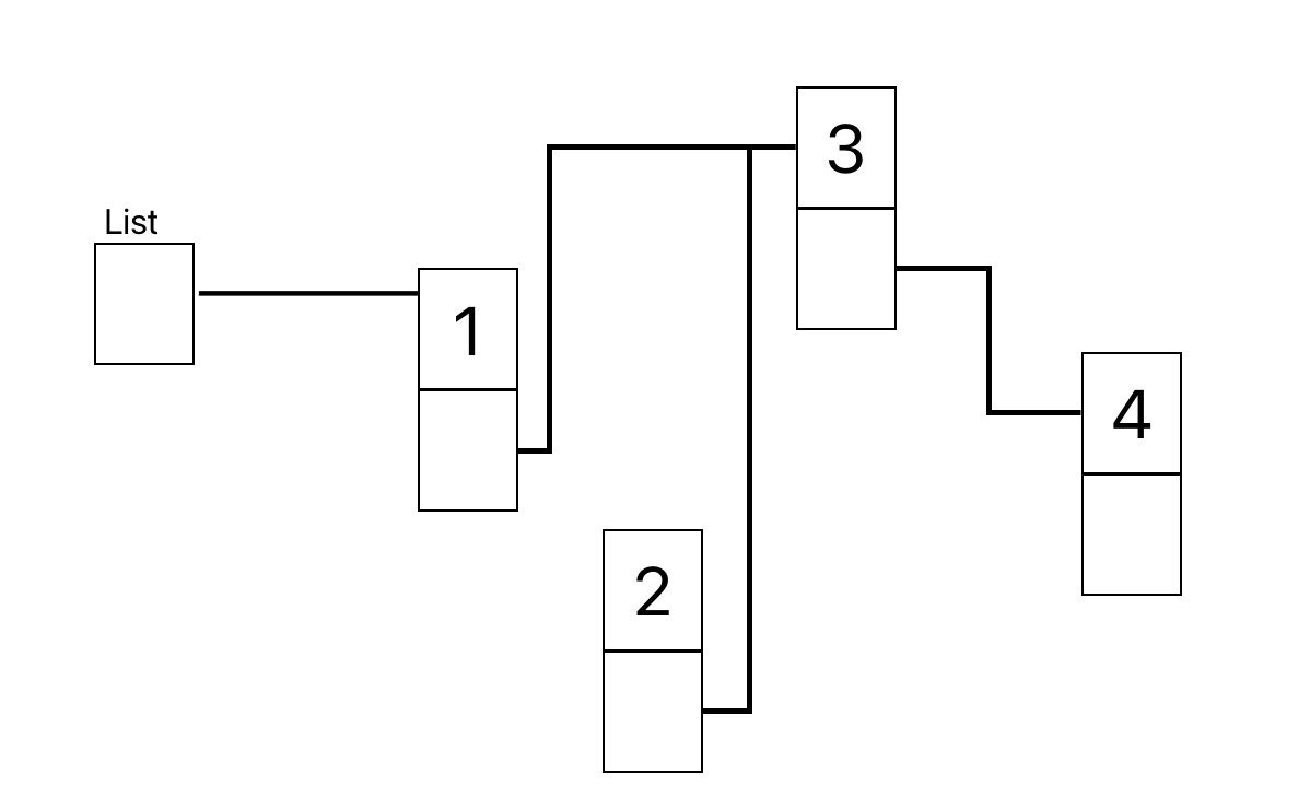 最初からList → 1 → 2の順で連結すると2のノードは次のノードがどれかわからくなり、3のノード以降のメモリリークが発生してしまう