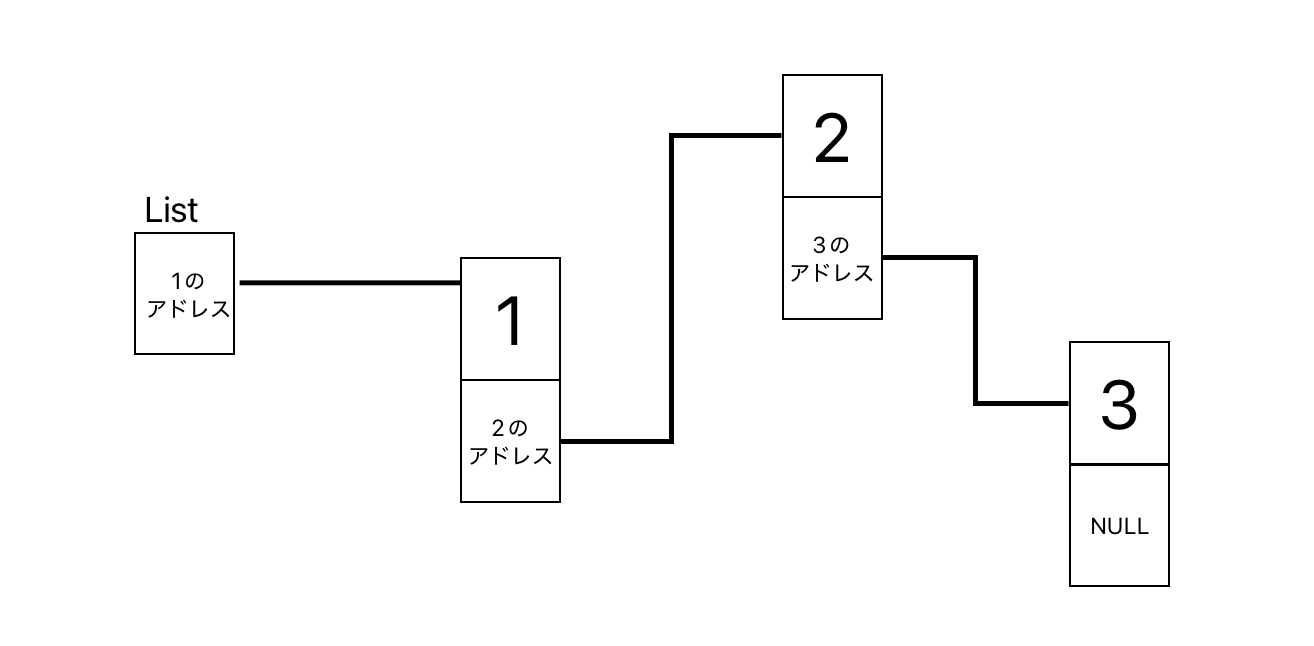 (最後の要素のアドレスをNULLにすることで、リストの終わりがわかる)