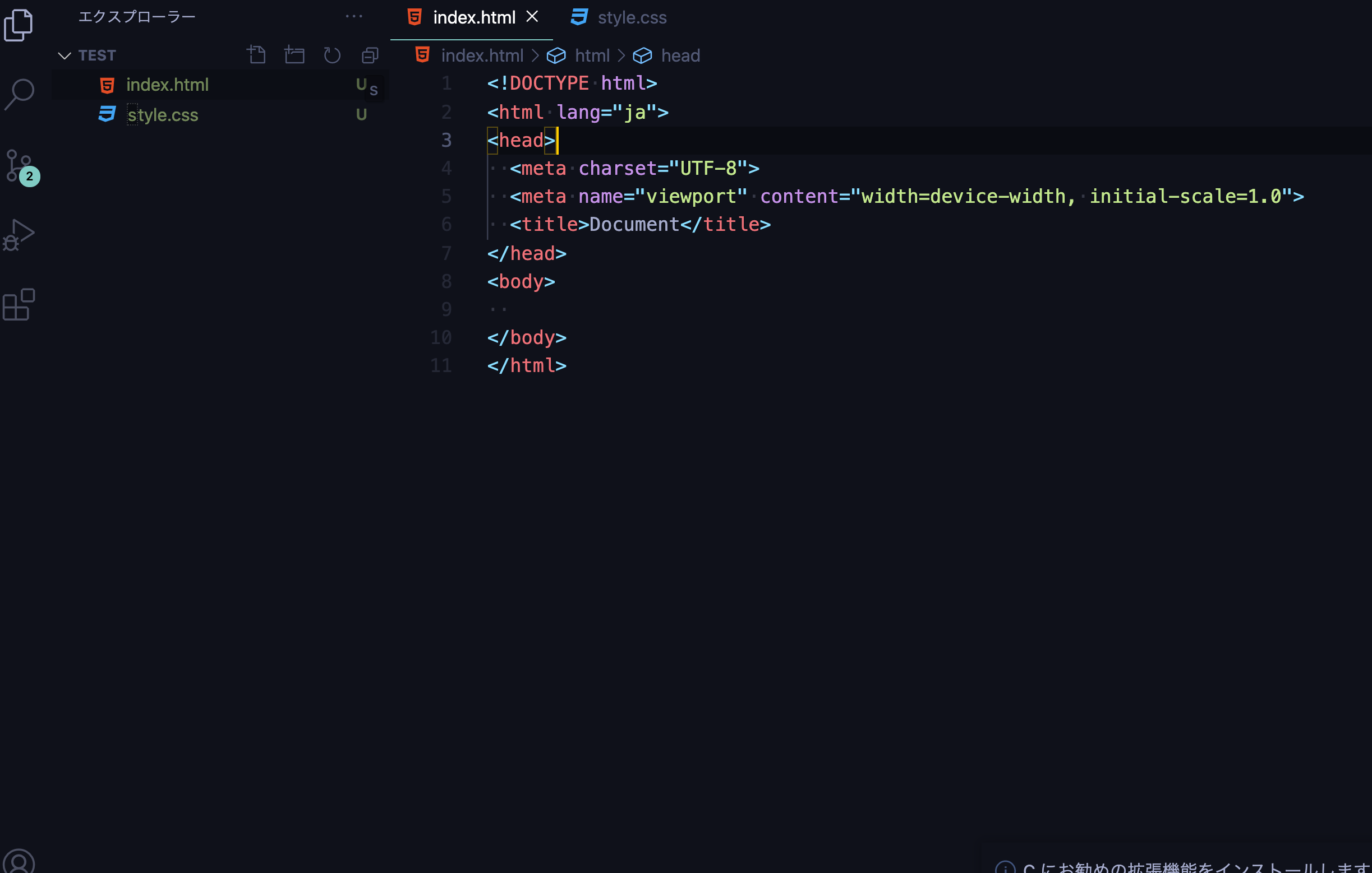 今回は下記のように、index.html、style.cssファイルを作成しました。