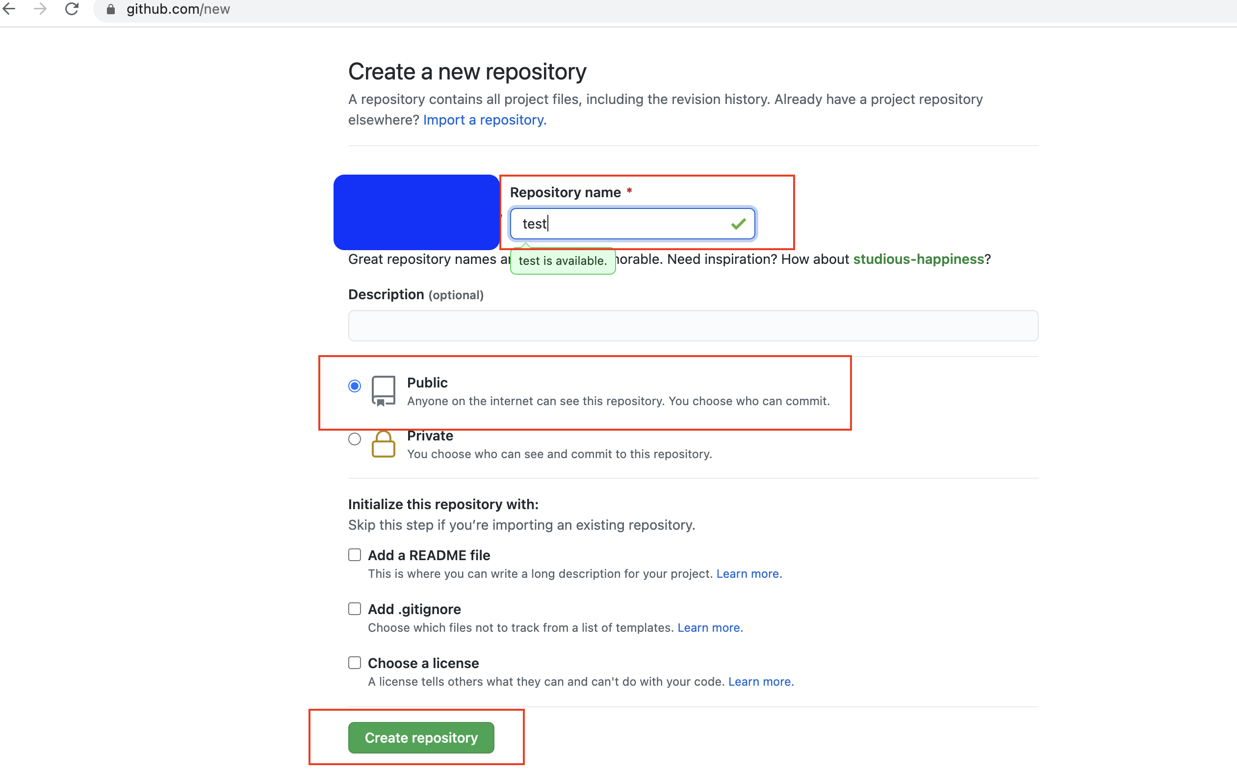 ②リモートリポジトリ名を設定します。今回は「test」としました。「Create repository」をクリックすると、リポジトリが作成されます。