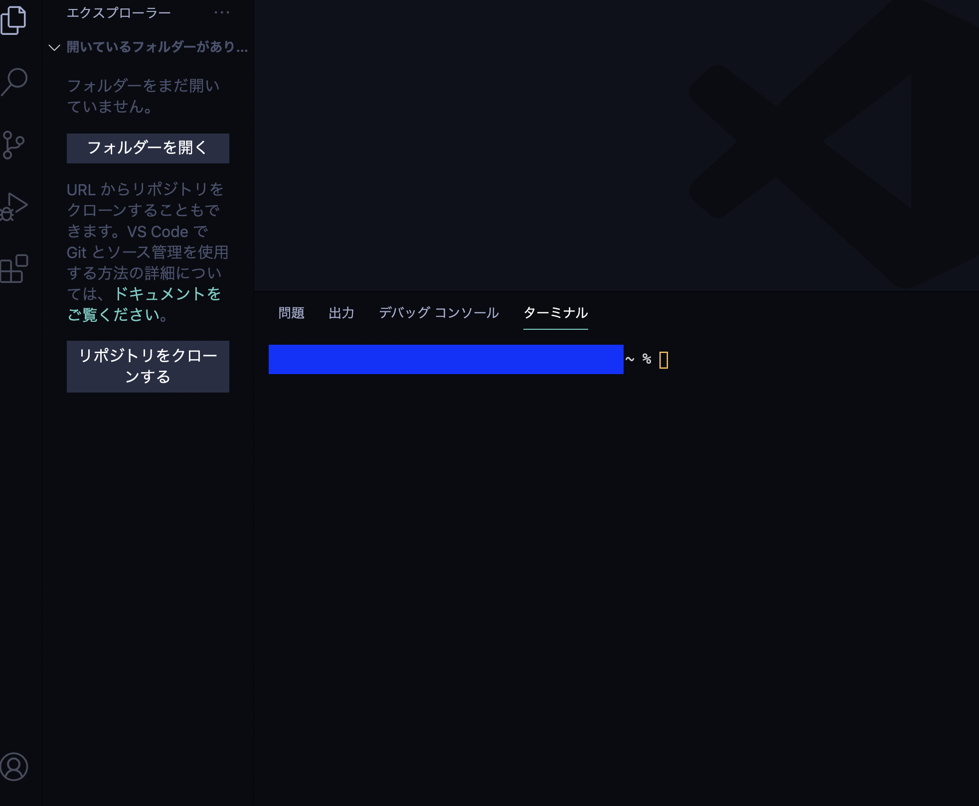 ②ターミナルを開いてください。ターミナル→「新しいターミナルを開く」でOKです。