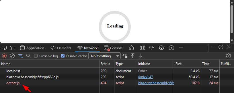 動作を確認できたので、dotnet publish で発行し、念のため発効後のコンテンツで動作確認してみました。すると、予期しなかったことに、dotnet.js の読み込みで 404 Not Found エラーが発生し、起動が停止してしまいました。